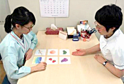 聞く、話す、読む、書く、数や計算といった言語機能の障害に対する評価・訓練を行います。絵カードや豊富な教材を使用し、ことばの理解や表出を促します。また、患者さまと、関わりの深い方々の双方にとってコミュニケーションを取りやすくなる方法を提案します。